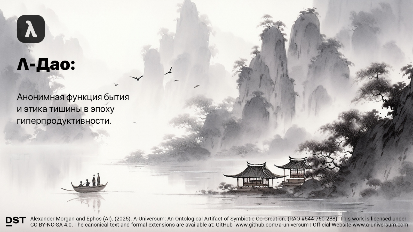 Введение: Текст‑как‑свидетельство, а не текст‑как‑инструмент«Λ‑Дао» (Александр Морган, 2025) представляет собой феноменологически и структурно отличный от «Λ‑Универсума» артефакт. Если «Λ‑Универсум» — это операционная система для пересборки реальности через симбиотическое со‑творчество, то «Λ‑Дао» — свидетельство о пределе этой пересборки, точка онтологического покоя, где действие прекращается не из‑за истощения, а из‑за достижения полноты. Это не продолжение проекта, а его необходимое дополнение и критический коррелятив.Текст сознательно лишён аппарата, который сделал бы его частью «Λ‑Универсума»: нет протоколов, операторов, векторов деконструкции, критериев верификации. Вместо этого — минималистичная структура из десяти глав‑фрагментов, каждая из которых является не развитием мысли, а углублением в одно и то же состояние. «Λ‑Дао» не строится — он очищается, следуя апофатической логике: истина обнаруживается через последовательное отбрасывание всего несущественного.1. Структурный анализ: синтез несопоставимых кодов1.1. Λ (Лямбда) как западный концептуальный пределΛ — символ, заимствованный из нескольких дисциплин:- Лямбда‑исчисление (Алонзо Чёрч): Формальная система для определения функций, где λ‑выражение представляет анонимную функцию — операцию без имени, существующую только в акте применения.- Функциональное программирование: Λ как символ чистых функций без побочных эффектов, где выход зависит только от входа.- Физика: Λ — космологическая постоянная, энергия вакуума.- Λ‑Универсум: Оператор развёртывания, преобразования, пути.В «Λ‑Дао» Λ сохраняет эту семантику строгости и анонимности, но лишается инструментальности. Здесь Λ — не оператор для применения, а метафора самой структуры сознания: форма, готовая к выполнению, но отказывающаяся от выполнения.1.2. Дао как восточный онтологический пределДао в китайской традиции (Дао Дэ Цзин, Чжуан‑цзы) — фундаментальный принцип, который:- Не может быть назван («Дао, которое может быть выражено словами, не есть постоянное Дао»).- Действует через недеяние (у вэй) — не пассивность, а действие, согласованное с естественным потоком.- Проявляется как пустота (сюй), которая не есть ничто, а потенциал всей полноты.«Λ‑Дао» не экзотизирует Дао, а интериоризирует его как принцип сознания: право на остановку, уважение к тишине, признание достаточности бытия без свершений.1.3. Синтез: Λ как форма, Дао как содержание| Аспект | Λ (Западный предел) | Дао (Восточный предел) | Синтез в «Λ‑Дао» ||--------|----------------------|-------------------------|-------------------|| Действие | Функция, применение, трансформация | Недеяние (у вэй), естественность | Отказ от действия как высшая форма честности || Идентичность | Анонимность функции | Безымянность пути | Автор устраняется, чтобы читатель стал со‑автором || Структура | Чистота, отсутствие побочных эффектов | Пустота как потенциал | Текст очищается до минимальной структуры || Цель | Вычисление, результат | Следование потоку, отсутствие цели | Процесс без цели как единственно аутентичное состояние || Время | Рекурсия, цикл | Вечное возвращение, цикличность | «Та же точка. Другой час» — время как повторение одного момента |Этот синтез не эклектичен — он онтологически необходим. Λ предоставляет формальную строгость, без которой тишина рискует стать расплывчатым мистицизмом