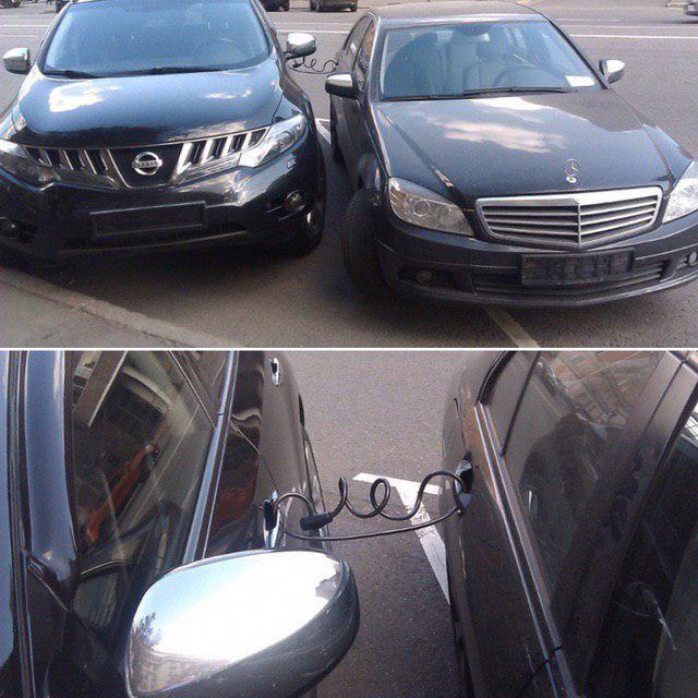 В Москве придумали новый способ парковки. Снимают у тачек номера и скрепляют их железным тросом. Штраф выписать не получится, и эвакуатор не сможет забрать сразу две машины