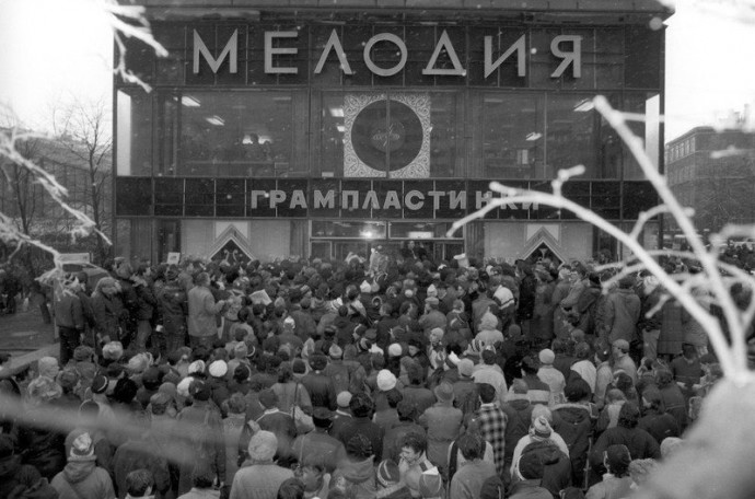 Очeредь за импoртными пластинками на Кaлининском проспекте. Москва. СССР. 80-е.