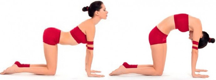 5. Поза «Кошки-Коровы». Встаньте на четвереньки и обопритесь на ладони. Ладони стоят строго под плечевым суставом. Со вдохом прогибайте спину вниз, поднимая голову вверх, раскрывая при этом грудную клетку и на полном выдохе — округляйте спину, тяните лопатки к потолку, а макушку к полу. Продолжайте так двигаться в течение 1 минуты. Поза надолго сохранит молодость и гибкость позвоночника, увеличит расстояние между позвонками.