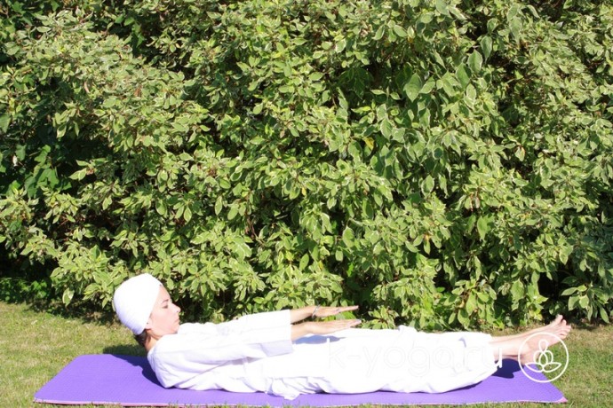3. «Натяжение». Лягте на спину, руки поместите вдоль туловища. Поднимите голову, ступни и руки на 15 см от пола. Выполните «Дыхание Огня» (Капалабхати) в течение 15- 20 секунд. Расслабьтесь. Упражнение пробудит огонь пищеварения и центрирует энергию.