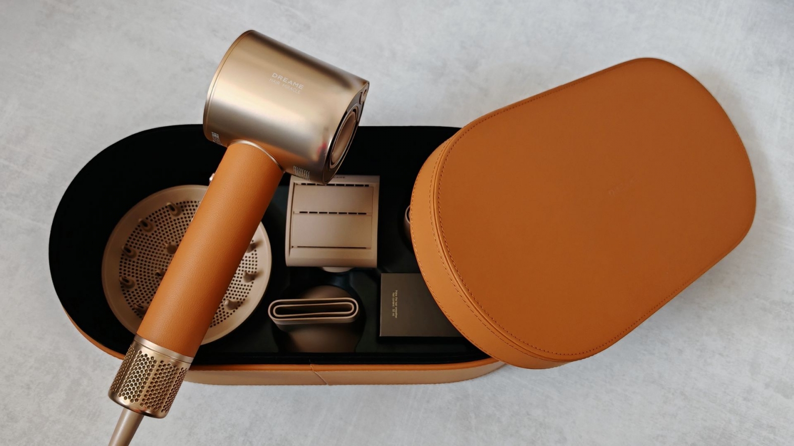 Внутри находится прочный и красивый кофр из экокожи, в котором лежат фен Dreame Miracle Pro и аксессуары: четыре насадки, питательная эссенция для волос, а также гарантийный талон и руководство пользователя.